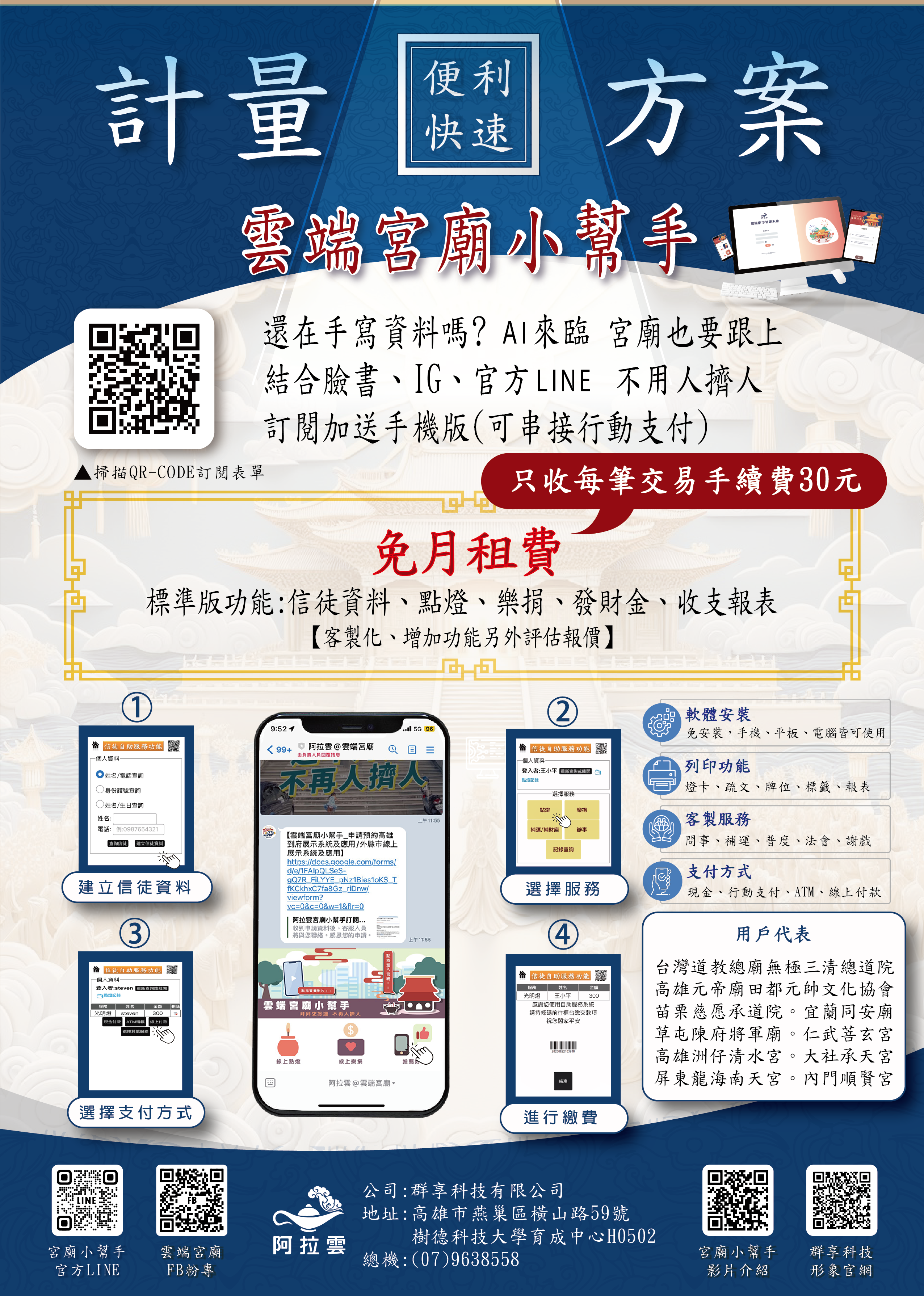 我們非常專注於開發和推廣宮廟管理系統-宮廟小幫手。這些系統旨在協助廟方進行廟務管理,並提供資料不落地、安全有保障的解決方案。這將幫助寺廟實現電子化管理,減少人為錯誤並提高工作效率。我們致力於為廟方提供先進、易於使用且功能豐富的系統,使寺廟管理變得更加便利。感謝你對我們的關注,如果有任何問題或需求,請隨時向我們詢問。